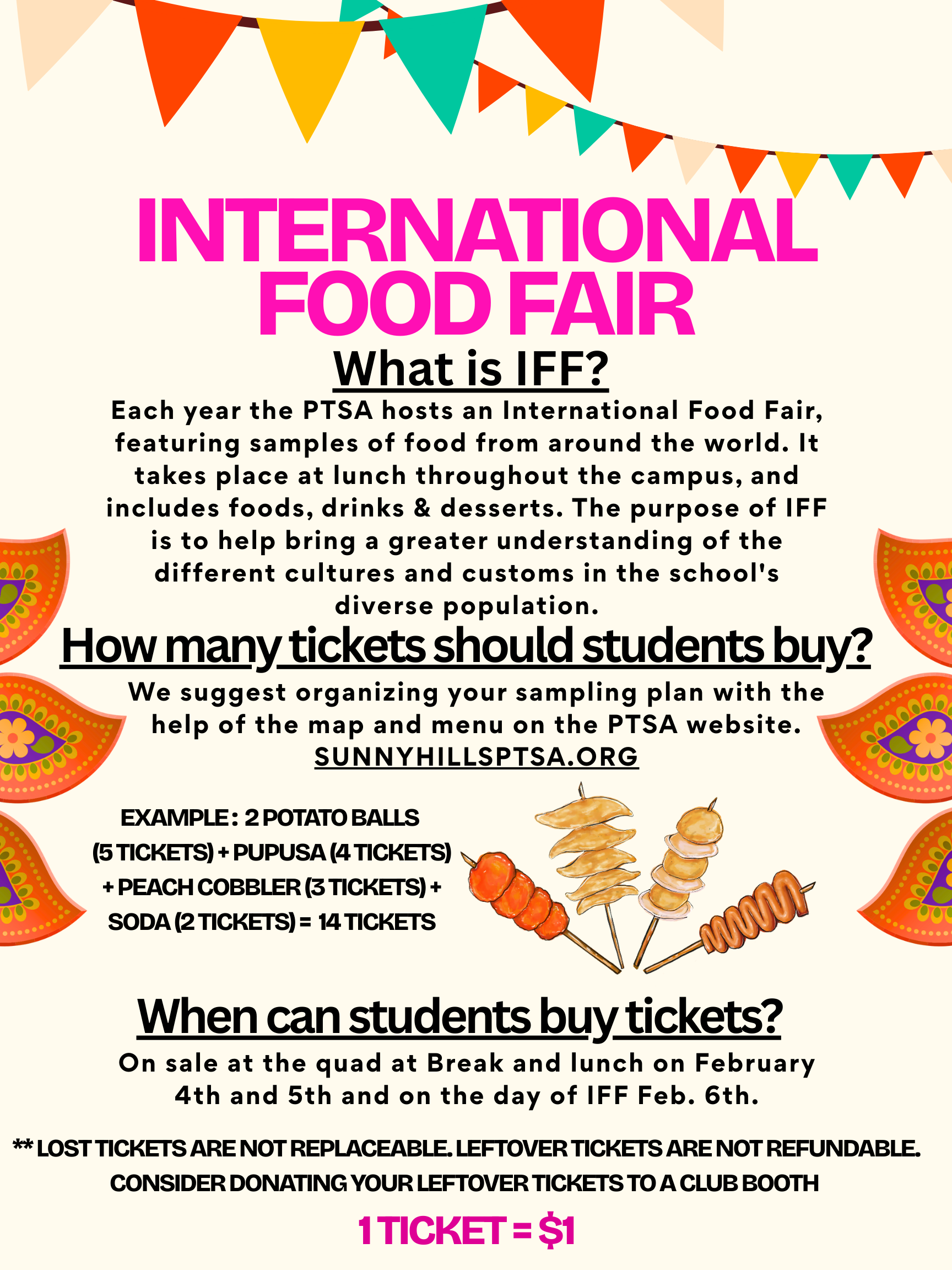 We achieve this goal by offering samples of foods that represent these countries that the students can purchase during their lunch. Sunny Hills PTSA hosts the main dishes and drinks. The school clubs are invited to provide the desserts.