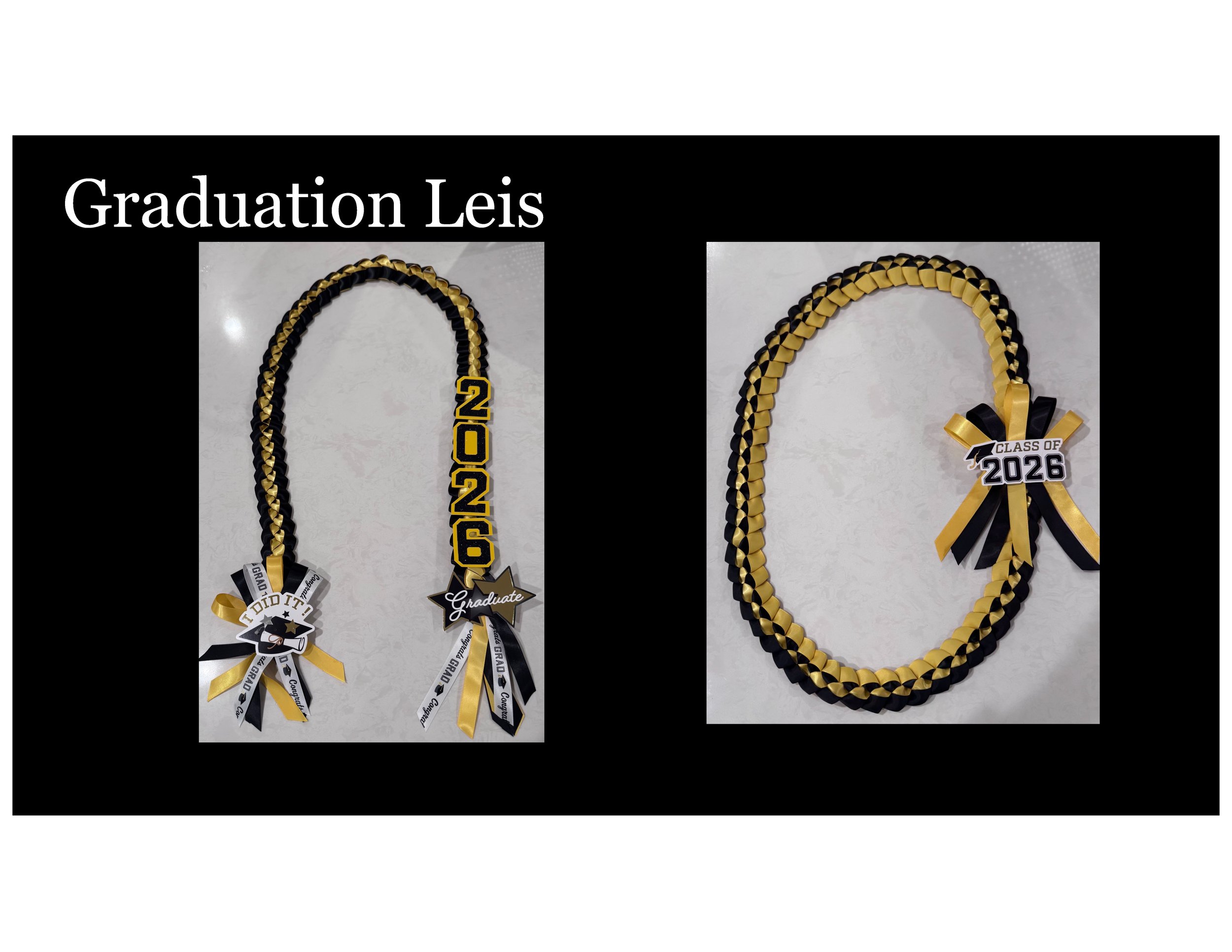 Graduation Leis - Handmade - Black & Gold ribbons- Decals vary - Limited quantities available.